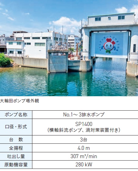 本ポンプ場は新川運河の末端に設置されており、潮位が上昇して自然流下できなくなると大輪田水門を閉じて、ポンプで強制排水しています。今回の改修では、ポンプの更新に併せて吐出し量を120%増強します。