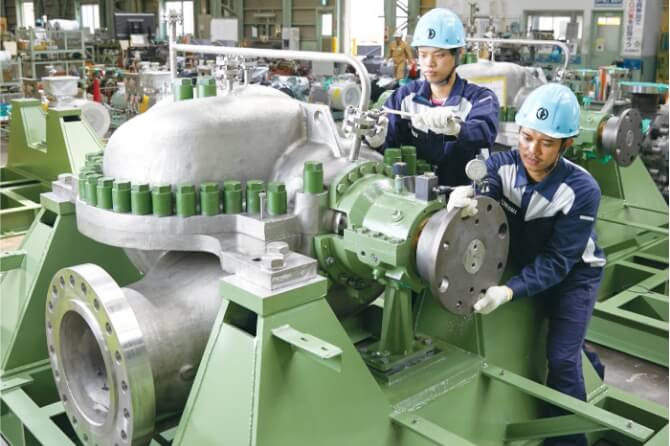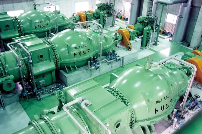 発電所や海水淡水化プラント、送水プラント、地域冷暖房、石油精製、化学工業など、幅広い分野に向けて、高性能・高効率の大型・高圧ポンプを提供しています。高度な設計により、エネルギー消費の削減や環境負荷の低減に寄与し、持続可能な社会の実現を支えます。