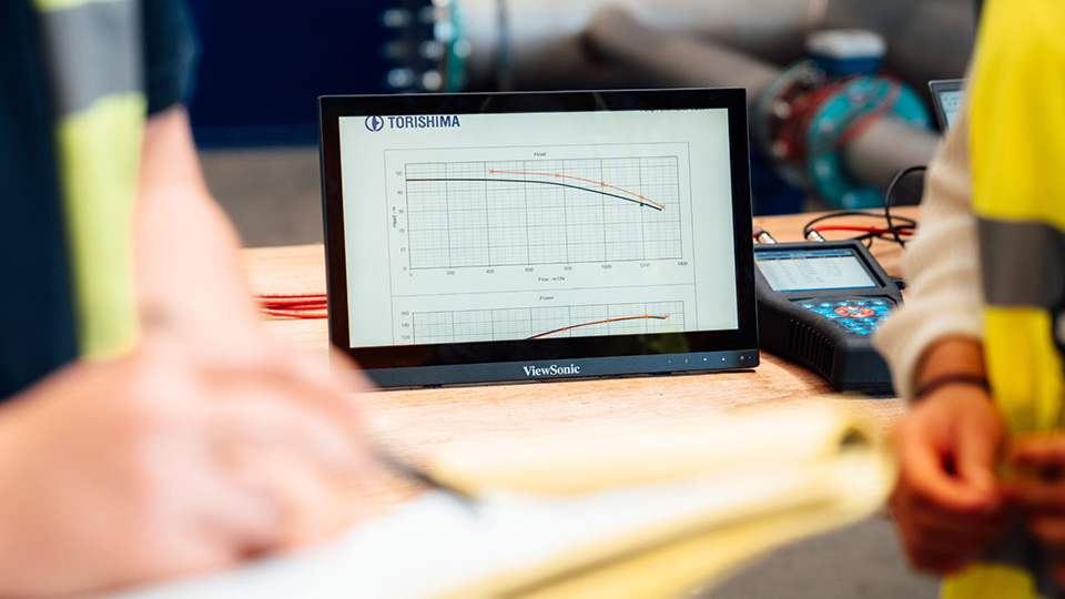 精密点検や性能試験など現地整備にはない多くのメリットがある⼯場持込整備により、ポンプ性能を確認します。